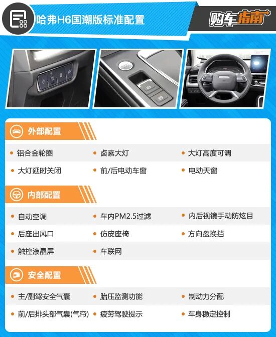 作为入门版车型,1.5T自动都市版的配置表现可圈可点,通过配置表可以看出标配了电动天窗、无钥匙进入/启动、方向盘换挡、12.3英寸中控屏、疲劳驾驶提醒、倒车影像、定速巡航等多项实用功能,并没有给哈弗H6家族丢人,如果对预算把控相对严格,那么基础配置满足日常也不成问题。