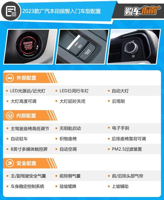 2023款广汽本田缤智的最低配车型的配置表现基本达到了家用车的合格线,如无钥匙启动、LED光源自动大灯、电子手刹、自动驻车、自动空调以及8英寸多媒体触控屏等功能均有所配备。不过像时下流行的主动安全系统、全速自适应巡航、智能语音控制、后排空调出风口以及无钥匙进入等功能均没有提供,同时该车还未配备倒车雷达和倒车影像等基础辅助功能,在实用性方面所有欠缺,所以此次并不推荐。