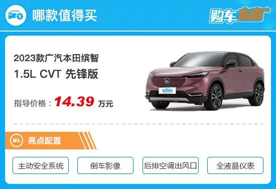 2023款广汽本田缤智共推出3款车型,售价区间为13.29-15.29万元。前期将仅提供搭载1.5L自然吸气发动机的车型,未来还有望推出e:HEV油电混合动力车型。