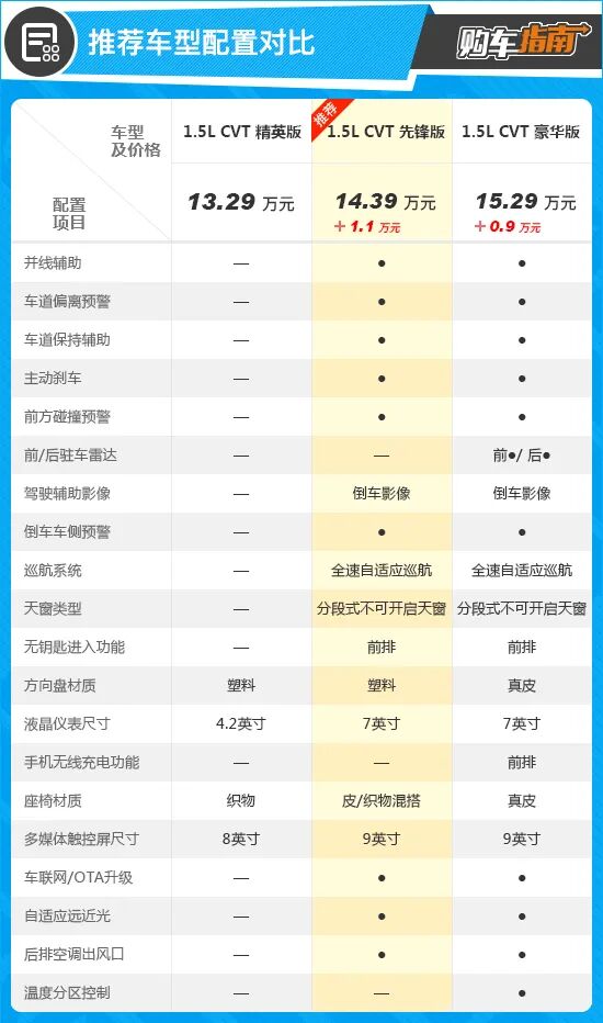 此次推荐的先锋版补齐了上述入门版车型在实用性配置方面的缺失,更符合时下主流的用车习惯。并且如全速自适应巡航以及智能语音识别控制等智能化功能的加入,能够为车主提供不同以往的用车体验。而与顶配的豪华版相比,后者增加了一些实用性配置,但都属于锦上添花而非刚需,为此多花9000元不太划算。所以综合来看,2023款广汽本田缤智1.5L CVT先锋版更值得推荐,购车时可优先考虑。