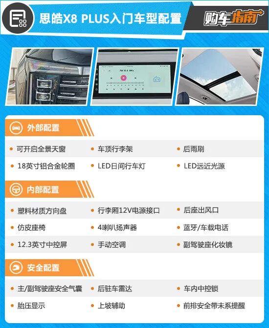 10万元左右预算,想购入一台适合多口之家出行的大空间SUV并不容易,因为这个价位段主要是以小型或者紧凑型SUV为主,由于车身尺寸的关系也导致空间受限,无法布置多排座椅。不过近日上市的思皓X8 PLUS诚意不错,这台6/7座大空间中型SUV起售价居然不到10万元,还标配1.5T高功率调校发动机,颇有些对同价位车型的降维打击之意。那么对于有意向购入的家庭用户,这台“个大量足”的思皓X8 PLUS买哪款配置更具性价比呢?本期《购车指南》带来解答。