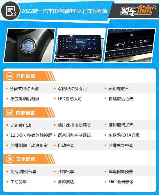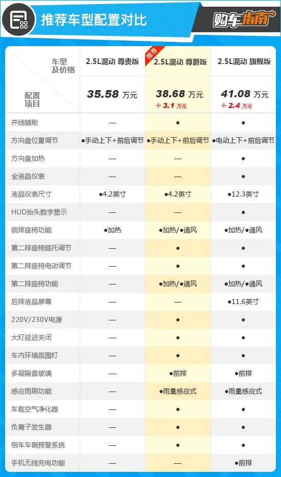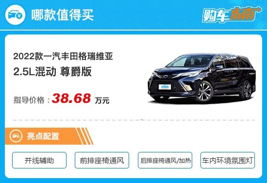 而顶配车型与推荐车型相比,虽然增加的配置也不少,但基本都属于“锦上添花”的类型,并非刚需。所以综合来看,2022款一汽丰田格瑞维亚 2.5L混动 尊爵版更值得推荐,购车时可优先考虑。