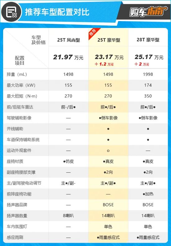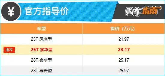至于28T 豪华型,相较推荐车型贵了2万元,除了前排座椅加热以外,区别主要集中在动力系统方面。不做推荐的理由其实非常简单,毕竟两者的百公里加速成绩差距仅有1s,几乎可以忽略不计。另外,更大排量发动机带来的油耗以及维护成本问题,我相信也都是年轻用户所不愿意看到的,再加上车型本身2万元的差价,因此性价比确实不高。综上所述,个人认为还是售价23.17万元的25T 豪华型性价比最高,消费者在选择时可以优先考虑。