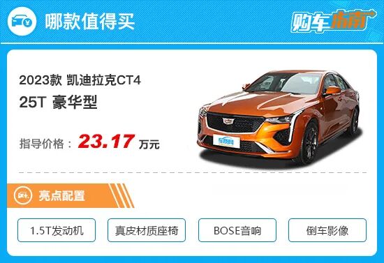 对于2023款凯迪拉克CT4的购买建议,我个人推荐售价为23.17万元的25T 豪华型。别看相较入门版车型贵了1.2万元,但是其在配置方面的提升却都是能够让年轻消费者喜闻乐见的,例如前驻车雷达、倒车影像、并线辅助、车道保持辅助系统、真皮材质座椅、副驾驶座椅电动调节、BOSE音响、单色车内氛围灯以及雨量感应式雨刷等,怎么说也都“值回票价”了。年轻用户选车,对于配置的需求见仁见智,别的不说,仅是一套好的音响系统,往往就能够博得不少好感。