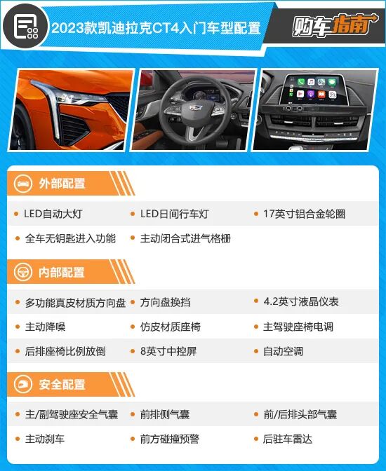 2023款凯迪拉克CT4入门版车型为25T 风尚型,售价21.97万元。客观来说,配置表现还算是可圈可点,包括LED自动大灯、多功能真皮材质方向盘、主动降噪、8英寸中控屏、自动空调以及主动刹车等,均为全系标配。虽然看似非常划算,不过对比来看,仅需再增加不多的预算,就有性价比更高的选择,因此综合来看,入门版车型不做推荐。