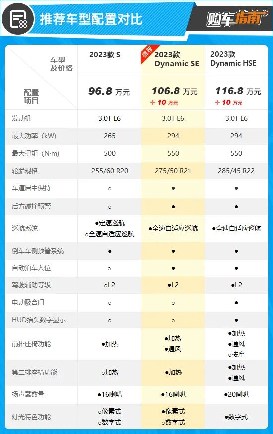 在入门车型基础上再加10万预算,就可以选择Dynamic SE车型,这也是2023款路虎揽胜运动版全系最推荐的一款。首先您能获得更强的动力,最大功率由入门车型的265kW增加到了294kW,对于燃油车尤其是豪华品牌燃油车,更大的功率还是非常有必要的,特别是对于这样一台自重较大的豪华SUV就更需要了。另外,推荐车型还增加了更大规格的21英寸轮圈、像素式大灯以及前排座椅通风和后排座椅加热,都是非常实用的配置,仅这些加起来,再对比路虎高额的选装费用,就已经值回升级的票价。另外对比入门车型新增的L2级驾驶辅助、自动泊车入位等配置,基本就相当于白送了,对于这样随便选选配置就几万出去的豪华SUV,这便宜难道占得不香吗?所以全系当中我更推荐选择这一款。
