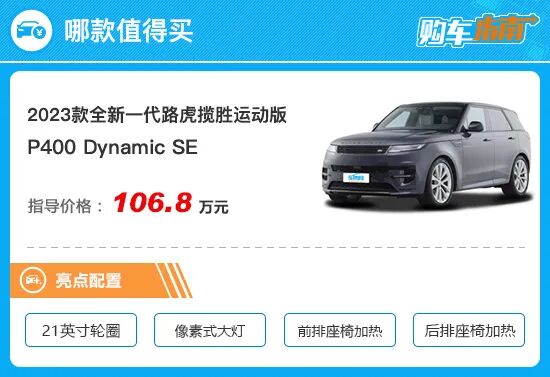 钱花到这就可以打住了,再向上更高配置的车型,主要就是锦上添花的体现了。Dynamic HSE车型,对比推荐车型,主要升级了20扬声器英国之宝音响以及电动吸合门,体验当然更尊贵,但这10万元应不应该花,相信大多数人应该会仔细考虑一下。如果您预算远不止这些,当然可以随意选择,但如果还会考虑性价比和实用性,那Dynamic SE车型就是最合适的选择。综上,Dynamic SE车型是2023款路虎揽胜运动版全系中车质网最推荐给您的选择,购车时可以优先考虑。
