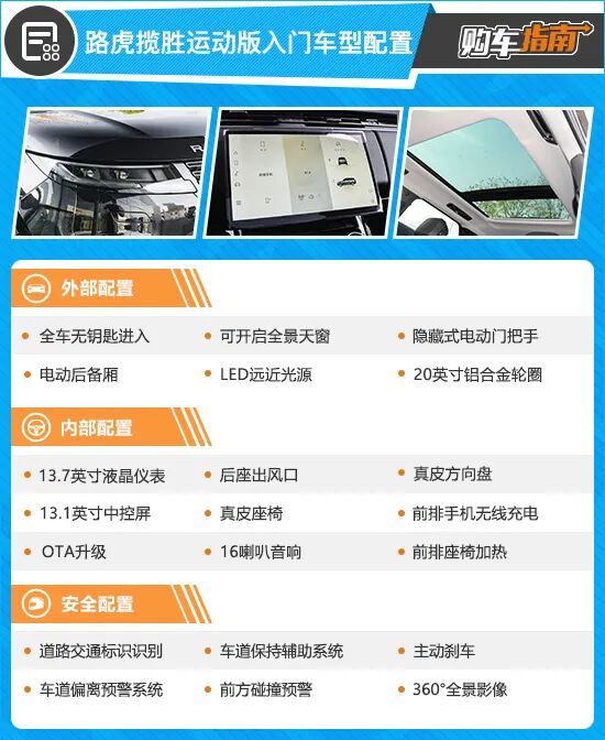 2023款路虎揽胜运动版入门车型的售价96.8万,作为一台门槛都接近百万的豪华SUV,自然不用担心其配置水平,真皮方向盘+真皮座椅、前排座椅加热、16扬声器音响、空气悬架以及丰富的主动安全系统,配置全面,对得起品牌和价位。如果您不是预算刚好够得到这款,我更推荐您选择高一个配置的Dynamic SE车型,绝对是物超所值,性价比要明显更出色。