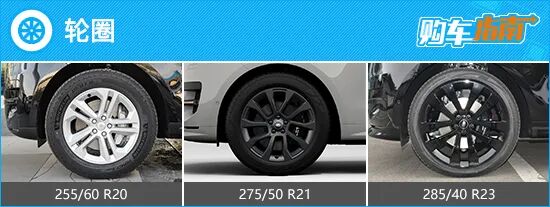 2023款路虎揽胜运动版针对不同车型提供有四种规格的轮圈,入门车型搭载20英寸双五辐样式轮圈,轮胎具体规格为225/60 R20;中配车型搭载21英寸轮圈,高配和顶配车型则分别搭载22英寸和23英寸轮圈。视觉效果上当然是轮圈越大越霸气,这就看您的预算是否宽裕了。