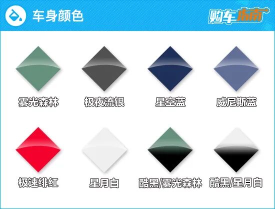 在车身颜色方面,新车为消费者提供了雾光森林、极夜流银、星空蓝、威尼斯蓝、极速绯红、星月白等配色,此外该车还提供了酷黑/雾光森林、酷黑/星月白两种双拼配色。其中官方主打的雾光森林配色较为出众,选购时可优先考虑。