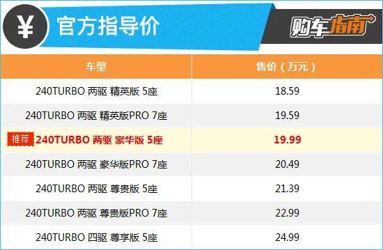 而较推荐车型更高一级的240TURBO 两驱 尊贵版 5座,配置上多出了电动后备厢、感应后备厢、并线辅助等功能,同时轮圈也升级为了18英寸,但购车预算增加了1.4万元,且多出的这些配置对实际用车体验帮助并不大。所以综合来看,240TURBO 两驱 豪华版 5座在售价以及配置方面表现出色,消费者购买时可优先考虑。