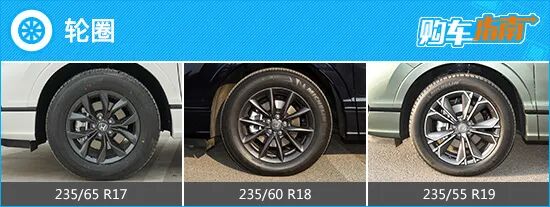 在轮胎方面,全新广汽本田皓影提供了3种轮圈样式可选,其中精英版和豪华版5座和7座车型轮胎尺寸均为235/65 R17;尊贵版5座和7座车型轮胎尺寸为235/60 R18;顶配四驱尊享版车型为235/55 R19。