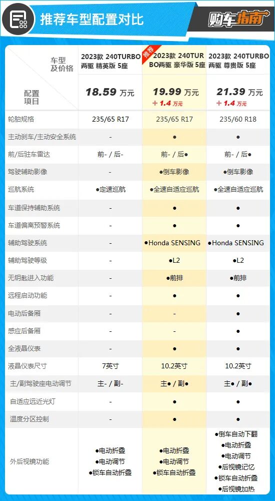 对于选购其他版本的消费者来说,小编更加推荐240TURBO 两驱 豪华版 5座,该车相比五座入门版车型来说,虽然多出了1.4万元,但是在配置上却提升不少,并且还搭载了Honda SENSING驾驶辅助系统,其中包括了车道保持辅助、车道偏离预警以及道路交通标识识别等,能实现L2级自动驾驶的能力,提高行驶安全。在其他实用性配置方面,推荐车型也多出了后倒车雷达、倒车影像、前排无钥匙进入、主副驾驶座椅电动调节等功能,此外,液晶仪表也升级为10.2英寸,这些都能为消费者带来更为出色的用车体验。