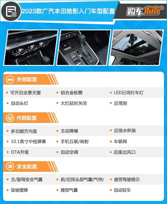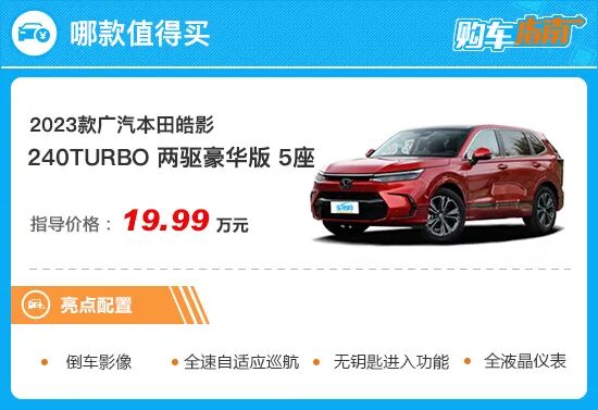 全新广汽本田皓影的入门车型为240TURBO精英版,该车起售价为18.59万元,从配置上来看,可基本满足日常使用,例如外部的LED日间行车灯、可开启全景天窗、内部的多功能方向盘以及比较完善的多媒体系统等。另外,相比老款入门车型,换代后的入门车型在被动安全配置方面进步很大,此前只有顶配车型才有的前/后排头部气囊(气帘)变为全系标配,并且全系新增了老款车型全系都没有膝部气囊。不过,在实用性配置方面,新款车型依旧有所缺失,例如前后雷达、倒车影像、主副驾驶座椅电动调节和温度分区控制等均没有配备,日常使用时略有不便。总的来说,入门车型整体配置水平中规中矩,在功能性和便利性上略有缺失,建议可增加预算看看更高配置的车型。