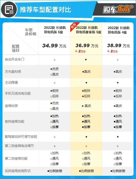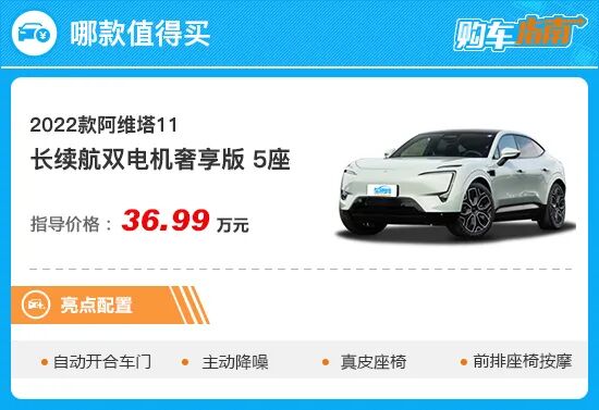 增加2万元预算就能选购到长续航双电机奢享版 5座,这也是阿维塔11全系最推荐购入的车型。首先明显补齐入门车型的短板,真皮方向盘、真皮座椅全部安排上,前排座椅加热/通风/按摩全部都有,舒适性直接拉满。另外推荐车型还增加了仪式感十足的自动开合车门,要知道这配置在入门车型上选装都需要1.5万元,仅这些已经完全值回了升级的票价,而像后排手机无线充电和主动降噪等配置,基本相当于白送,难道不香吗?就配置水平对应到价格来看,长续航双电机奢享版 5座的性价比十分出色。