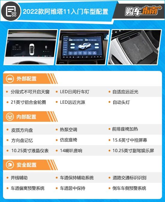 长续航双电机版 5座是阿维塔11的入门车型,售价为34.99万。作为一款售价超过30万的中国品牌车型,配置水平完全不用担心,21英寸大轮圈、内饰三块大屏、5G车联网系统以及全面丰富的主动安全配置都是标配,足以满足日常使用需求。不过这台车型缺少的是档次感和舒适度,方向盘和座椅皆不是真皮材质,前排座椅也仅有加热功能,30来万选择一台中国品牌车型,档次感和舒适度不够,自然心里还是有一定落差,所以我推荐您看看更高配置的长续航双电机奢享版 5座,补齐了短板,且明显性价比更高。