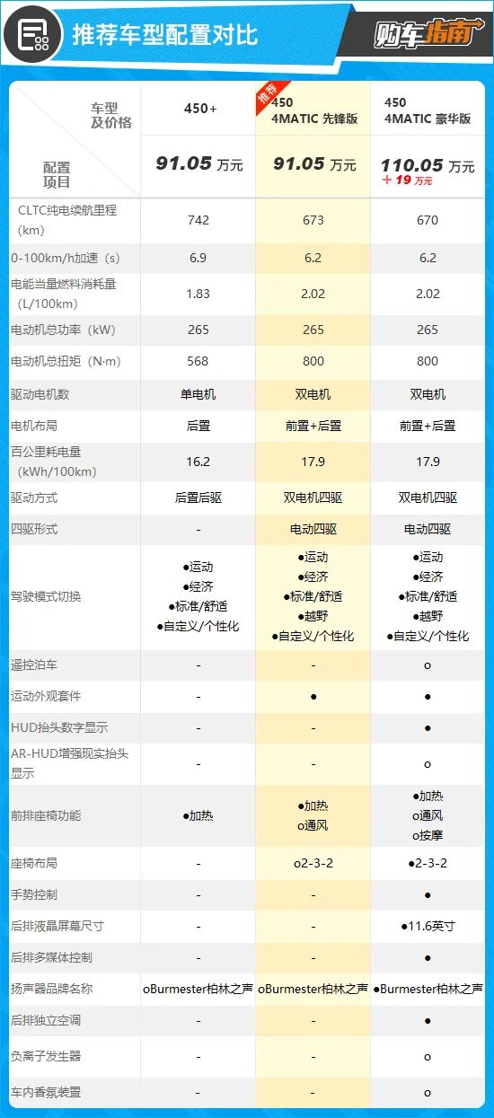 综合来看,我更加推荐450 4MATIC 先锋版,售价同为91.05万元,与入门版车型保持一致。配置方面,两款车型的表现基本相同,推荐车型多出了运动套件,另外基于双电机四驱系统,还增加了“越野”驾驶模式选择。至于第三排座椅以及前排座椅通风,都只是提供了选装机会而已。之所以推荐这款车型,主要是因为前置+后置双电机驱动系统确实很有诱惑力,动力表现更为出色。虽然续航里程有所降低,但是673km的成绩也依然称得上优秀,完全能够满足日常使用所需。