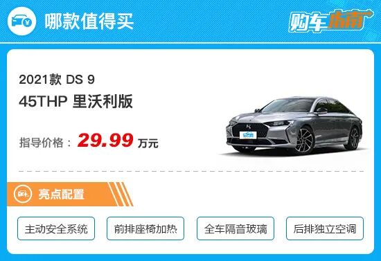 虽然国内消费者并不十分认可DS品牌“高端”的定位,但是作为一款旗舰车型,该有的舒适性及豪华配置还是不应该舍弃。综合配置来看,个人首推售价为29.99万元的里沃利版。相比次低配车型,推荐车型配备了19英寸轮圈,视觉效果更为大气,此外8色车内环境氛围灯、后排独立空调、全车隔音玻璃以及后排隐私玻璃的配置,对于豪华感的营造也颇为到位。再加上丰富的主动安全系统以及真皮座椅、前排座椅加热以及座椅记忆等舒适性配置,对于一款豪华定位的旗舰轿车,这样的表现起码是及格的。当然,考虑到DS 9的整体价格区间的确偏高,因此还是需要做出取舍,配置权衡也要点到为止。