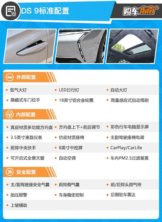 DS 9入门版车型是售价24.99万元的蒙马特版,即便自身定位为“豪华品牌”,奈何消费者的认可度不高,因此这个起售价仍然难言亲民。配置方面,虽然不算寒酸,但整体表现并无亮点,像是氙气大灯、3.5英寸液晶仪表、8英寸中控屏等,都是其“专属配置”。相比之下,次低配车型的表现明显要好上不少,所以横向对比来看,入门版车型的综合性价比非常一般。退一步讲,就算只是钟情于DS 9的外观设计,18英寸轮圈以及后排并非隐私玻璃这两点也实在太过掉价,因此入门版车型并不推荐购买。