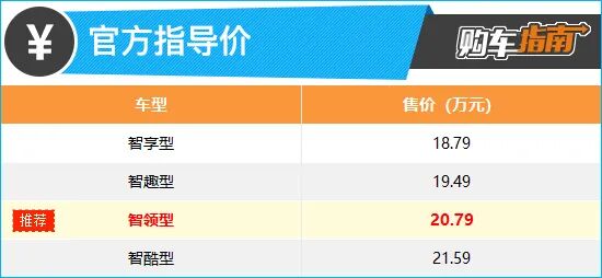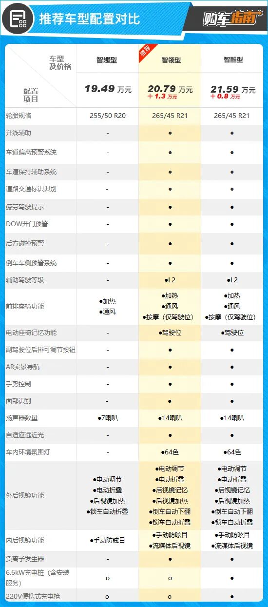 综合来看,售价20.79万元的智领型配置较为均衡,非常值得推荐。相较低一个配置车型,其不仅增加了主动安全系统,而且在舒适性及科技配置方面也有诸多提升,另外轮圈也升级为21英寸,差价不过1.3万元,相当划算。