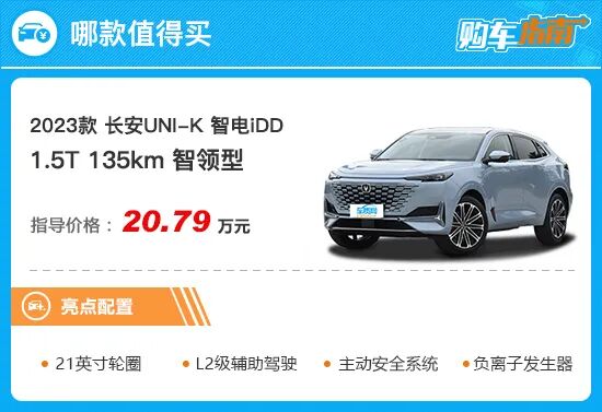 长安UNI-K 智电iDD定位中型SUV,共有4款配置可选,售价区间为18.79-21.59万元。其中,智领型和智酷型配置完全相同,仅在细节方面有所区别,因此消费者可以简单地将新车分为高、中、低三款配置,外加一款特殊设计的顶配版本,方便区分和对比选择。