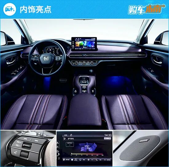 车辆内饰沿用了本田家族式设计理念,中控台整体造型平直,搭配贯穿式空调出风口,增加了内部层次感。在配色上,顶配车型除了黑色外,还提供了黑色/栗色双拼颜色。全系标配的10.1英寸悬浮式中控屏内部配备了本田CONNECT 3.0智导互联系统,可支持QQ音乐、百度Car-Life、车联网、导航以及语音交互等功能。此外,除了入门车型外,其余车型版本均配有10.2英寸液晶仪表。