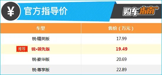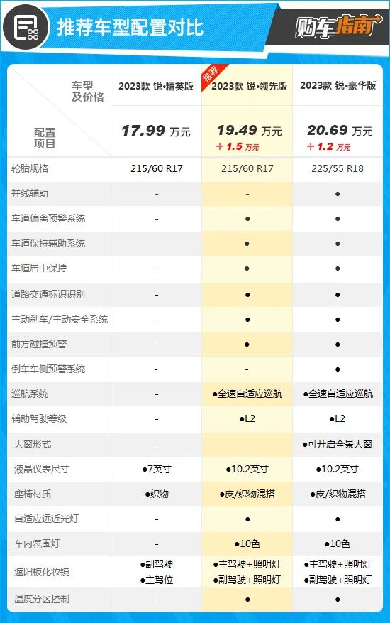 对于选购其它版本的朋友来说,小编更加推荐锐·领先版。作为中配车型,推荐车型相比入门车型配置更加全面,尤其是在安全方面表现更加出色,增加了行车时的安全性。在舒适性配置上,该车也多出了自适应远近光灯、温度分区控制。此外,该车还配备了10.2英寸液晶仪表,这些都大幅提升了性价比。