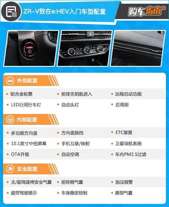 广汽本田ZR-V致在e:HEV入门车型为售价17.99万元的锐·精英版。在配置上,该车外部配备了LED日间行车灯、LED前大灯以及前排无钥匙进入等功能,整体表现还是比较实用的,在内部,该车在多媒体方面表现出色,例如车载Wi-Fi、OTA升级、导航以及手机互联等,满足日常娱乐完全没有问题,但不足之处在于,该车安全配置方面较为基础,并且在一些实用性配置上,例如温度分区控制、自适应远近光以及全液晶仪表等均没有配备。结合接近18万元的价格,入门车型的配置确实有些“寒酸”,因此不做推荐。