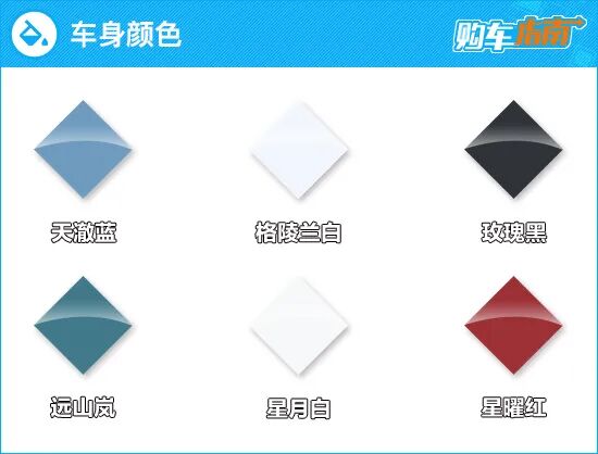 在车身颜色方面,新车提供了6种颜色可选,他们分别为天澈蓝、格陵兰白、玫瑰黑、远山岚、星月白、星曜红。其中天澈蓝以及远山岚配色出众,消费者可优先考虑。