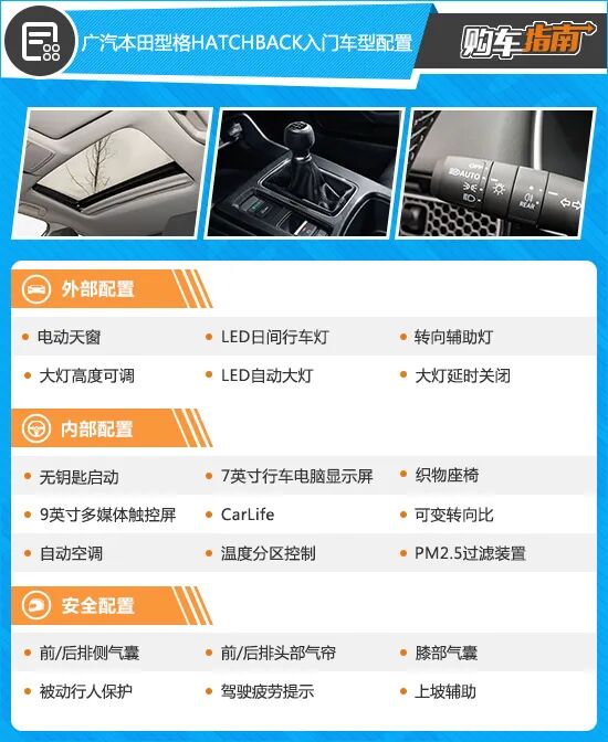 2023款广汽本田型格HATCHBACK的入门版是全系唯一匹配6速手动变速箱的车型,其舒适性配置表现比较寒酸,但胜在被动安全防护功能全面。可见这是一款为手动挡爱好者专门打造的特殊车型,符合其“手动专属版”的车型名称。但这样的表现很难让大部分家用消费者满意,这也是此次不推荐入门版车型的主要原因。
