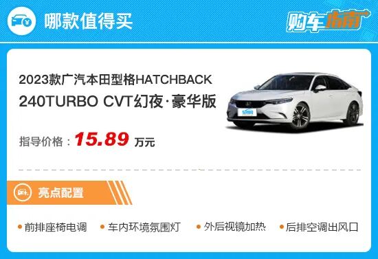 当然,燃油版还有比推荐车型配置更高的幻夜·尊享版,但两者的配置差异并不大,如NFC钥匙、前排手机无线充电以及BOSE音响等也并非刚需。至于2.0L e:HEV 锐·豪华版混动顶配车型,其与推荐车型配置表现相仿,但价格高出了2.4万元,如果想通过混动系统超高的燃油经济性补回差价有点得不偿失,不过驾驶体验上确实是混动版更好一些。所以综合来看,2023款广汽本田型格HATCHBACK 240TURBO幻夜·豪华版最值得推荐,购车时可优先考虑。