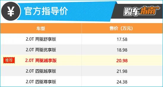 在剩下的三款车型中,我们更推荐2.0T两驱越享版车型,其售价20.98万元,相比上一档配置车型,多出了全方位的智能辅助驾驶和主动安全系统。此外,还多出了真皮座椅、副驾驶座椅腰部支撑调节、驾驶位电动座椅记忆、副驾驶位后排可调节按钮、自适应远光灯、256色氛围灯、前排多层隔音玻璃、外后视镜锁车自动折叠等配置。虽然贵出了2万,但增加了非常丰富的安全性、实用性以及舒适性配置。