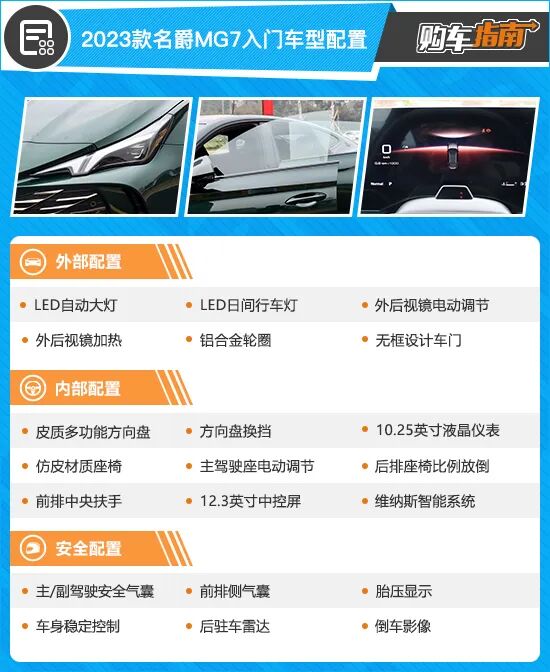 2023款名爵MG7入门版车型为至美舒享版,售价11.98万元。配置方面,带有LED自动大灯、外后视镜加热、无框设计车门、多功能方向盘、12.3英寸中控屏、后驻车雷达以及倒车影像等,不仅丰富实用而且还颇具亮点。尤其是全系标配的无框设计车门,确实相当吸引眼球。如果预算实在有限,那么入门版车型倒也算是值得入手,只不过并非是最优选择。