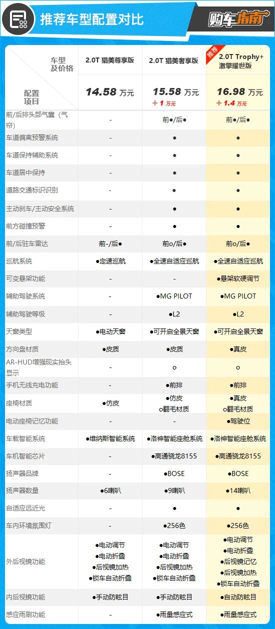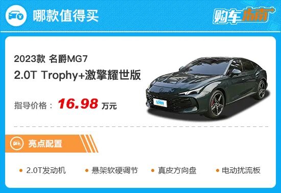 针对2023款名爵MG7的购买意见,个人首推顶配的2.0T Trophy+激擎耀世版,售价16.98万元。名爵MG黑标的标签就是“极致”二字,而名爵MG7凭借着优秀的综合实力以及强悍的产品力,也确实做到了这一点。对比次低配车型,推荐车型独享专属的19英寸铝合金轮圈、悬架软硬调节、驾驶位电动座椅记忆功能、自动防眩目内后视镜以及14扬声器BOSE音响,结合1.4万元的差价来看,绝对物有所值。