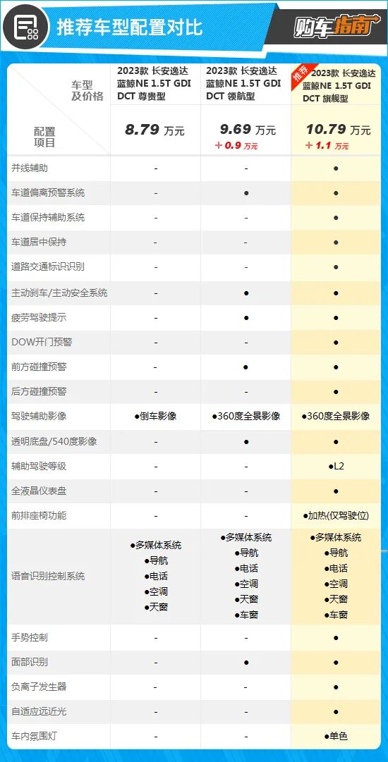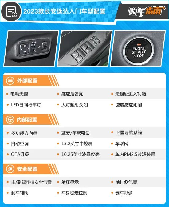 长安逸达入门车型为1.5T自动尊贵型,该车售价为8.79万元。从配置上来看,该车表现还算不错,外部配备了电动天窗、感应后备厢、驾驶位无钥匙进入等功能。在内部,例如4G网络、导航、OTA升级以及自动空调等均有配备。但不足之处在于,入门车型没有配备辅助驾驶系统,例如车道偏离预警、车道居中保持等,同时该车辅助影像系统只提供倒车影像。总的来说,入门车型虽说功能表现比较全面,但是在辅助驾驶方面缺失较大,此次不做主要推荐。