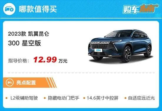 2023款凯翼昆仑共推出7款燃油版车型,其中凯翼昆仑300 高原版和300 山峰版配置非常低,而凯翼昆仑500 星空版和500 银河版的价位又太高,性价比不足,故不推荐这四款车型。