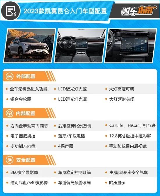 2023款凯翼昆仑的入门车型售价9.99万元,配置方面除了搭载1.6T发动机以外,还拥有全车无钥匙进入功能、18英寸铝合金轮圈、LED远光灯光源、LED近光灯光源、12.8英寸中控屏、CarLife/HiCar手机互联、360度全景影像、透明底盘以及车道偏离预警系统等。入门级车型虽然价位较低,但配置方面的丰富程度还是有些不尽如人意,故不做推荐。