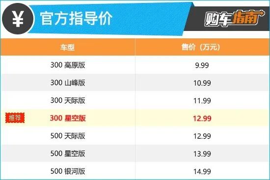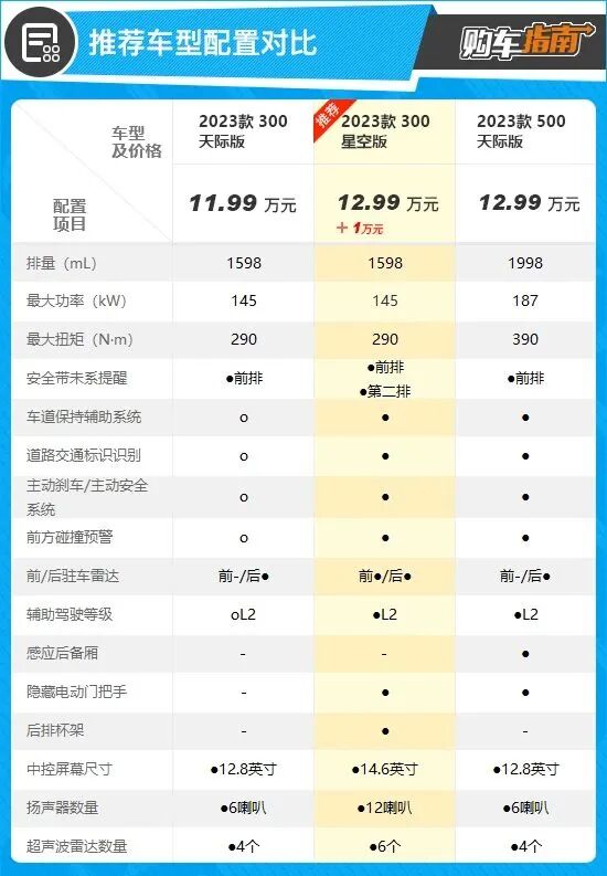 天际版那样进行选装,300 星空版标配就有。这么看来,多出的1万元为用户带来了更全面的安全防护以及用车体验,值得推荐。