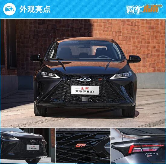 此次改款奇瑞官方并未对新车外观进行调整,2023款艾瑞泽5 GT依旧沿用了老款车型的设计,大嘴式进气格栅内部采用黑色蜂窝网格装饰,搭配红色“GT”标识,极具运动气息。前大灯采用黑化处理,内侧配备了闪电造型的LED日间行车灯,点亮后具有较高的辨识度。前保险杠两侧配备了尺寸夸张的空气导流装饰,强调其运动化的定位。