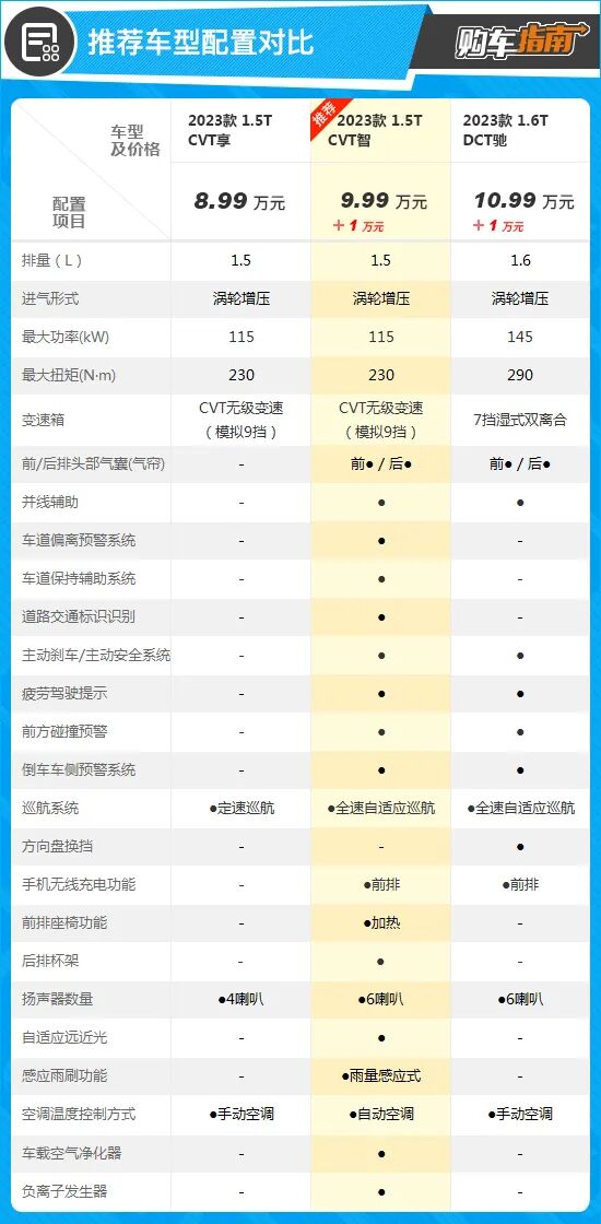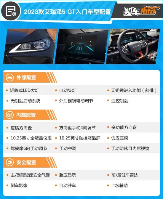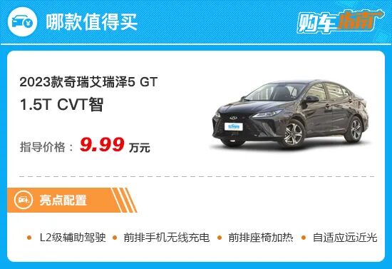 至于1.6T DCT驰,售价已经突破10万元大关,特点在于搭载了性能稍强一些的1.6T发动机,不过配置水平明显低于推荐车型,同样不做推荐。因此,对于普通家庭消费者而言,动力足够、价格和配置更有优势的1.5T CVT智综合性价比更高,在购买2023款艾瑞泽5 GT时建议优先考虑。