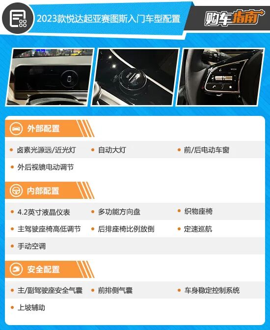 2023款悦达起亚赛图斯的入门版车型配置表现比较寒酸,仅提供了比较基础的实用和安全配置,大量舒适性功能的缺失加之近11万元的起售价,确实竞争力不强,故不作推荐。