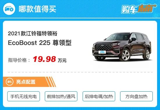 而顶配车型相比推荐车型,在配置层面也有不小的提升,最直观的就是19寸轮圈升级为20寸,视觉效果更好。此外,还新增了感应后备厢、AR实景导航、自动泊车入位等实用性层面的配置。相比之下,这些新增配置更多起到了锦上添花的作用,并不属于消费者刚需,而且为此要多花费2万元,性价比并不算高。因此综合来看,如果您正在关注江铃福特领裕,那么2021款EcoBoost 225 尊领型值得您优先考虑。
