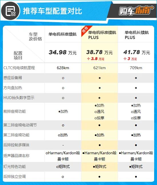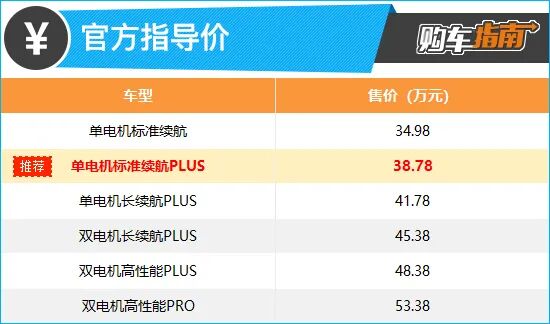 从全系配置来看,新车共分为单电机版和双电机版两个大类,考虑到日常使用情况,显然单电机版更为合适,价格也更为亲民。而从三款单电机车型来看,小编向您推荐单电机标准续航PLUS,也就是次低配车型。推荐车型将入门车型诸多选装配置升级为标配,如感应后备厢、方向盘加热、HUD抬头数字显示、第二排座椅电调和加热以及哈曼卡顿音响等,不仅逼格提升一个档次,使用体验也得到了提升,售价仅需多花费3.8万元,性价比较高。