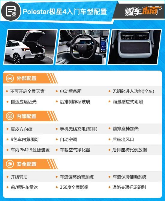 从Polestar极星4入门车型来看,配置表现相当出众,不仅配备了大量基础配置,更有将舒适性和实用性提升一个档次的高阶配置。例如电动后备厢、后排侧隐私玻璃、雨量感应式雨刷、真皮方向盘、前排座椅加热、自动空调以及360度全景影像等均有所配备。不过,作为一款定位高端性能的纯电动车,这些配置还不足以支撑牌面,因此我向您推荐单电机标准续航PLUS车型。