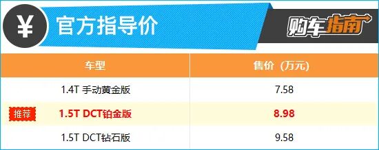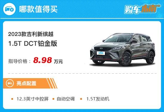 通过配置对比,小编向您推荐中配车型,也就是1.5T DCT铂金版。推荐车型相较入门车型不仅新增加了自动驻车、12.3英寸中控屏、高德地图、语音识别控制系统、驾驶位车窗一键升降以及自动空调等实用性配置,动力上更是搭载了与缤越COOL相同的1.5T发动机,并匹配了7挡湿式双离合变速箱,驾驶体验感会更加出色。售价仅需增加1.4万元,性价比足够高。