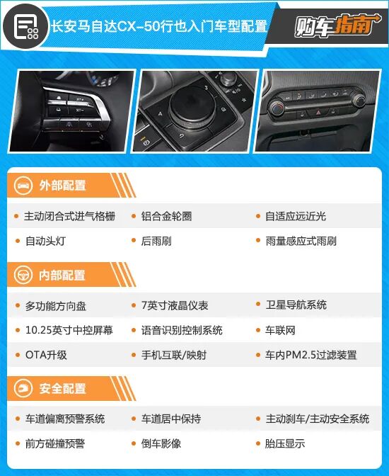 长安马自达CX-50行也的入门车型为2.0L驭行版,该车售价为15.98万元,其基础配置比较完善,例如外部的自适应远近光、自动头灯、雨量感应雨刷以及内部完善的多媒体系统,满足日常使用不成问题。但不足之处在于,首先2.0L自然吸气发动机对于这台车来说,动力并不充沛,且有些“小马拉大车”的味道。其次在配置上,该车也有不小缺失,例如LED日间行车灯、可开启全景天窗、无钥匙进入功能、前后驻车雷达等。总的来说,入门车型配置满足日常使用不成问题,但无法满足更进一步的用车需求。