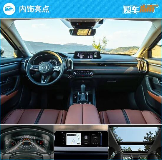 车辆内饰沿用了马自达品牌一贯的简洁设计语言,平直的中控台中间配有贯穿的空调出风口装饰,配合下方的红色缝线,增加了内部层次感。车辆仪表盘采用了液晶仪表+机械指针的组合,中间的7英寸显示屏可提供巡航、挡位以及行车电脑等信息。10.25英寸中控屏内置了第三代马自达悦联系统,支持车联网、卫星导航系统、手机互联、语音识别控制系统、OTA升级等功能。