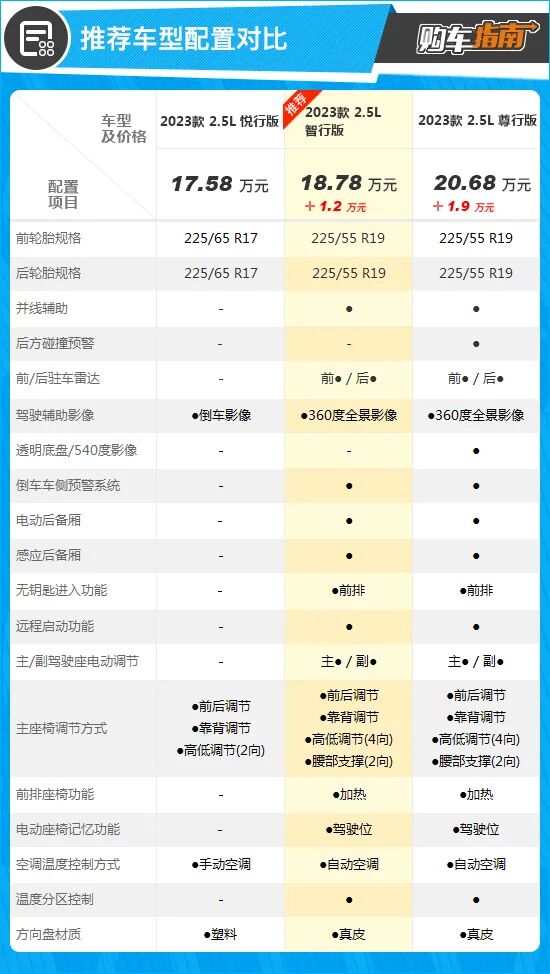 如果您选购长安马自达CX-50行也的话,小编更加推荐2.5L智行版,首先推荐车型在动力方面有着较大优势,其次作为全系次顶配车型来说,在配置上更为全面。与低一配置车型相比,推荐车型增加了电动后备厢、前排无钥匙进入、远程启动、前排座椅加热以及自动空调等便利性配置,差价为1.2万元,性价比较高,可以算得上是物有所值。