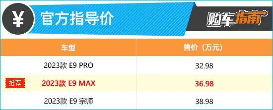 2023款广汽传祺E9共推出3款车型,售价区间为32.98-38.98万元。订车用户可享受用车无忧、交车保障、智能进阶、尊享专属、惊喜来电等购车优惠政策,同时2023年6月30日前(含)订车还可享520元抵5200元超级权益(增换购优先)(详询当地经销商)。