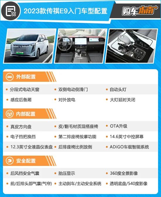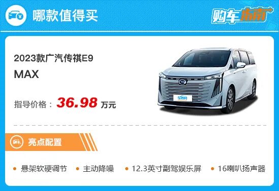 从配置方面可以看出,2023款广汽传祺E9的入门车型在乘坐舒适性方面的配置和其它车型相似,而在安全性、辅助驾驶、便利性以及部分娱乐性配置方面相对薄弱,故不做主要推荐。作为一款中大型MPV车型,丰富的配置自然是最应当拥有的,所以我们更推荐下面这款2023款广汽传祺E9 MAX。
